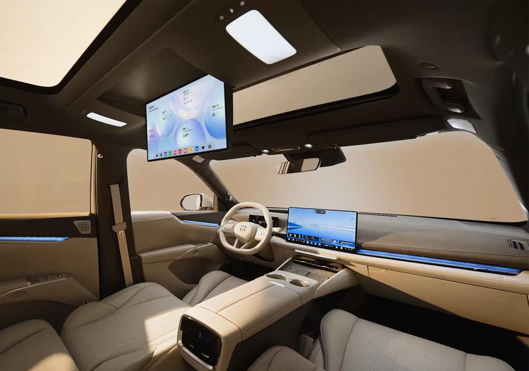 拉开车门,内饰才是别克真正发力点。8.8英寸仪表+15.6英寸中控屏+50英寸AR HUD,三屏联动,支持CarPlay、HiCar、CarLink,手机互联没落下。重点在座椅:四座都标配三档加热通风,前排带多点按摩和电动调节,后排靠背可以在115°到125°之间电动调节。副驾那个伊姆斯零重力躺椅是精髓,坐垫、靠背、腿托多角度可调,腹部和腿部都能达到120°躺姿,午休神器。二排有多功能桌板,带专属笔槽,承托很稳;椅背后面有拓展接口,能给设备供电。全车还有15.6英寸后排影院屏、7.1.4杜比全景声20扬声器音响、银离子保鲜冷暖箱(2-50℃可调)。前风挡和四门都是5mm双层夹胶静音玻璃,后排隐私玻璃也是标配。后备厢容积650L,放倒后排能扩展到1798L。内饰颜色提供松烟紫黑和云上雅米两种,质感不错。